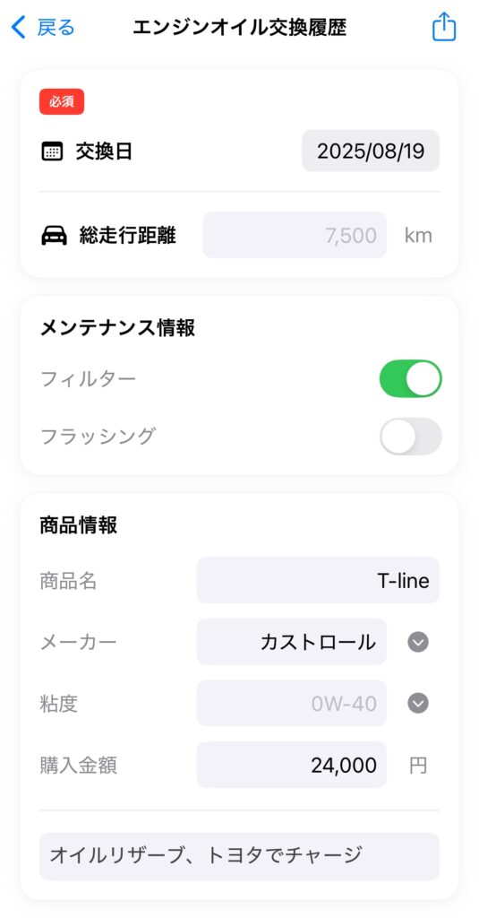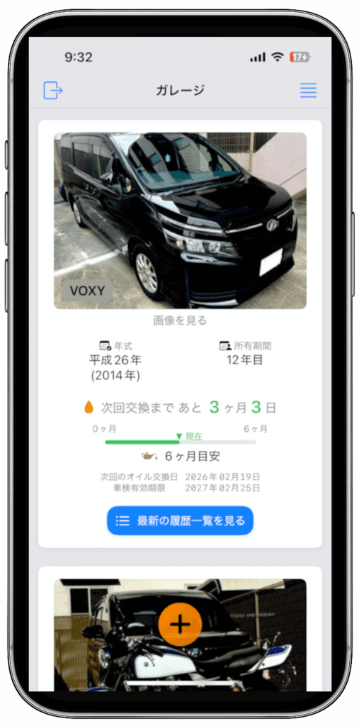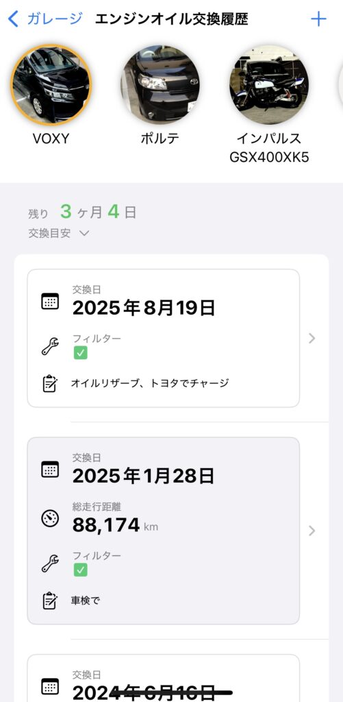 登録したメンテナンス履歴は、一覧画面でいつでも確認できます。履歴が積み重なっていくと、愛車との思い出みたいな感じでうれしい気持ちになりませんか?