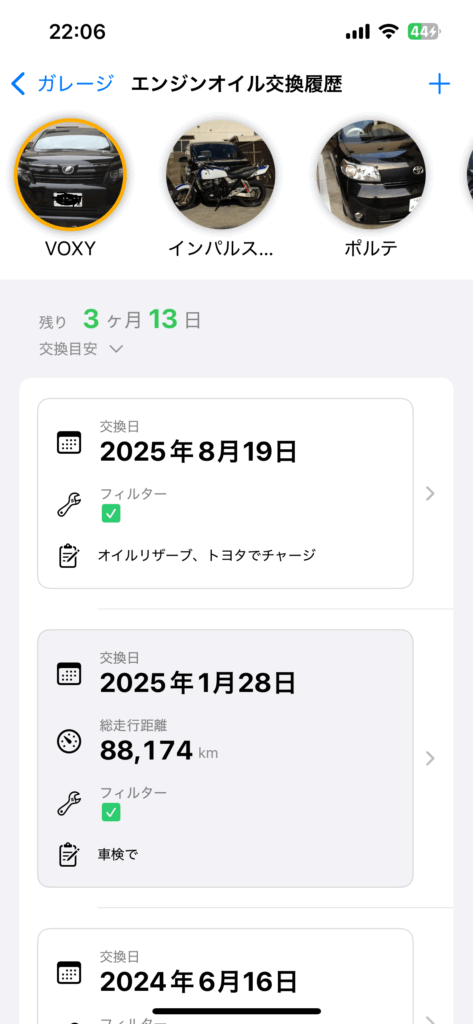 そろそろエンジンオイル交換かなと、カーメンテのエンジン交換履歴を振り返ると、来年でした。懐かしてくて昔の履歴を見ると、初回の履歴は2017年になってました。愛車との歴史を感じます。