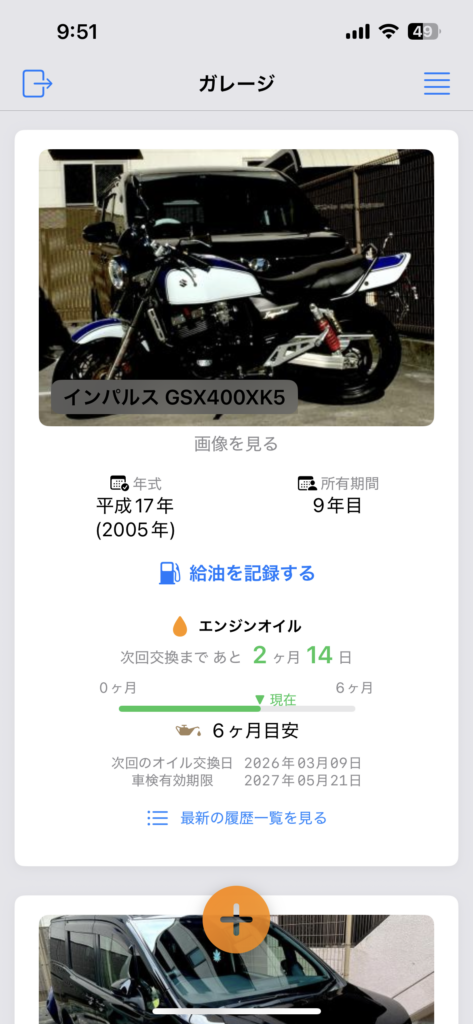 給油は、他のメンテナンスに比べて履歴登録の頻度が高い