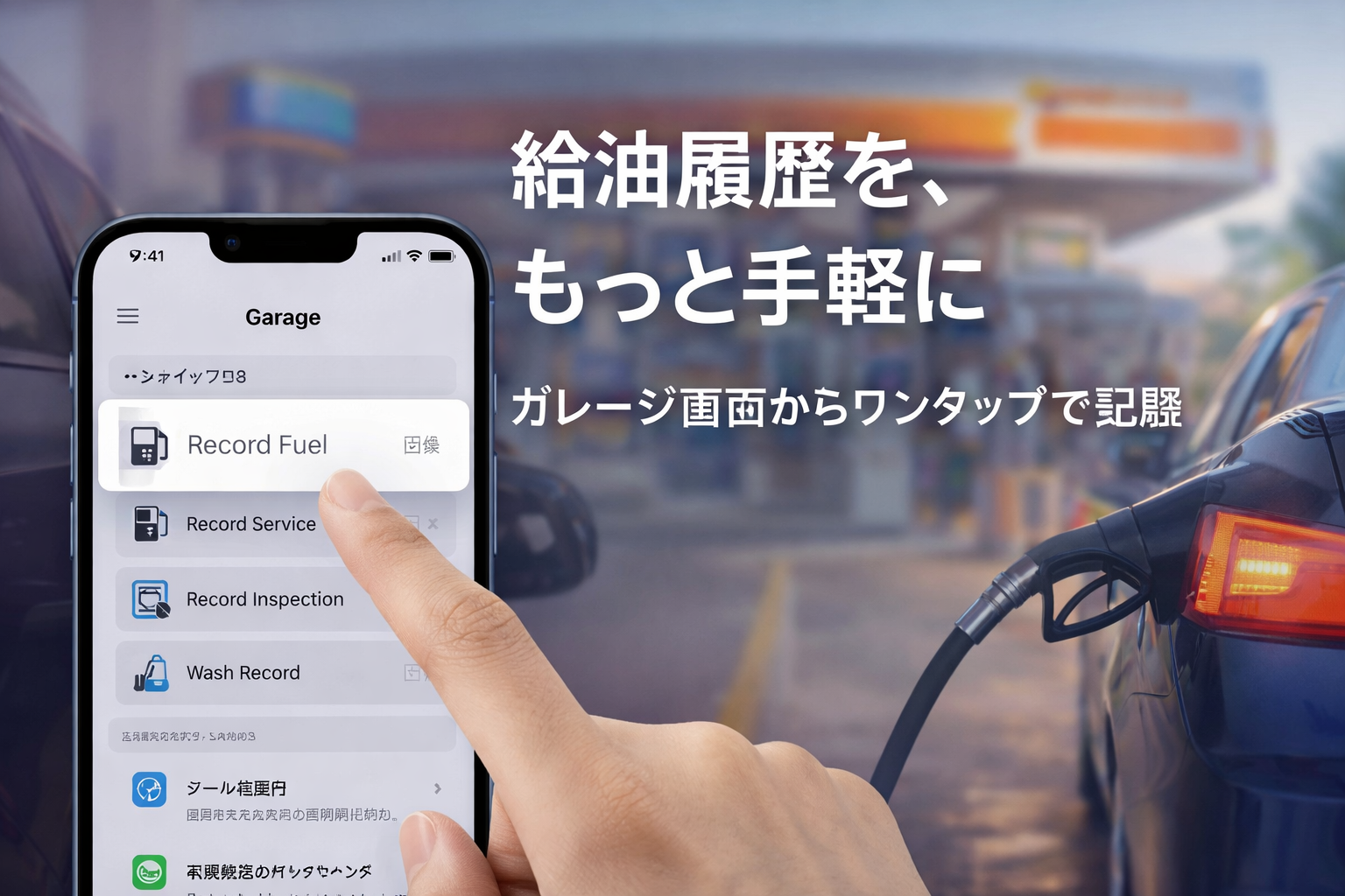- ガレージ画面の「給油を記録する」をタッチ