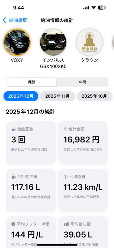 給油履歴が月に2回以上登録すると、給油情報の統計情報を表示することができます。