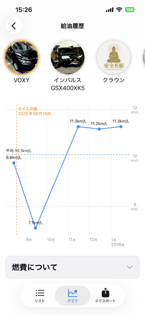 燃費とエンジンオイル交換の相関関係をグラフ上で見ることができます。