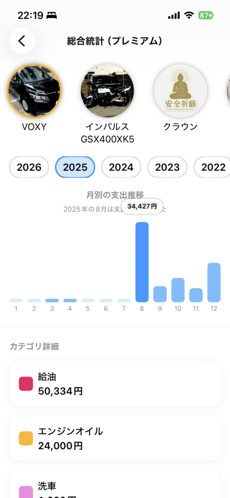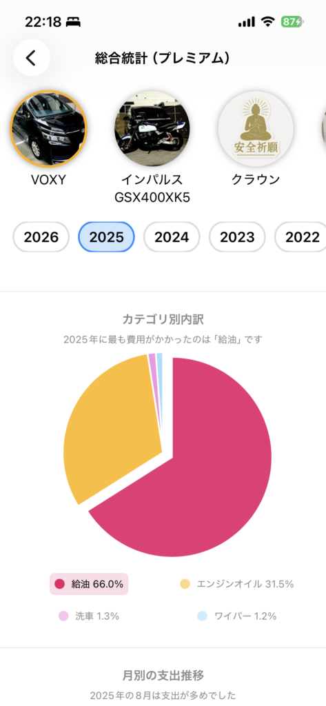 カーメンテ(iOSアプリ)2026.01.21総合統計(プレミアム)画面をタッチ ポスト シェア はてブ 送る Pocket プレミアム機能をご利用の方、気づいてもらえてますでしょうか?統計情報画面で年間の支出額を円グラフ月別の支出額を棒グラフで表示しています。 円グラフの項目をタッチすると、なんとハイライトされます。棒グラフの項目をタッチすると、月の支出額の合計が表示されます。 ちょっとしたことですが、見やすくなる工夫をしてみました。