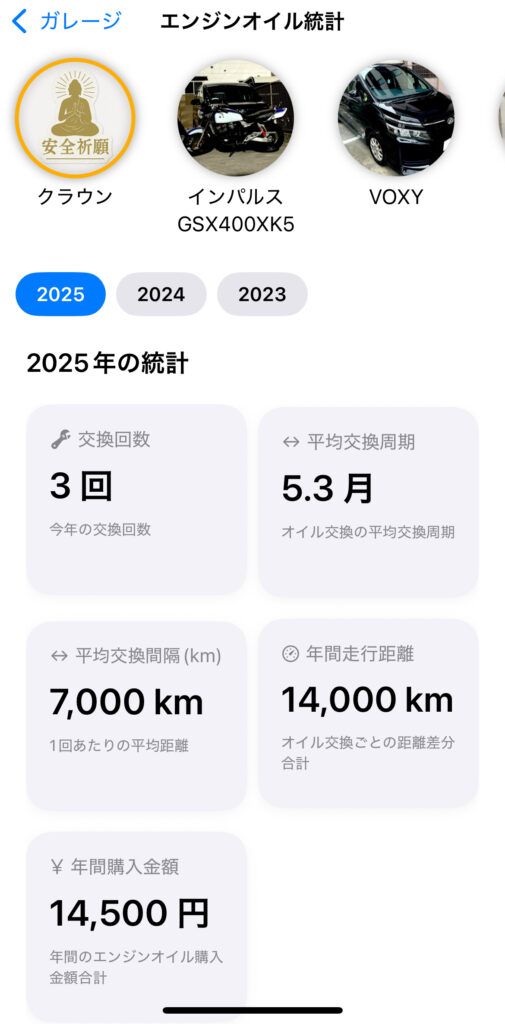統計情報では、過去の交換履歴を振り返りやすくなり、メンテナンスの傾向が見やすくなるので、愛車管理がもっと楽しくなると思います。