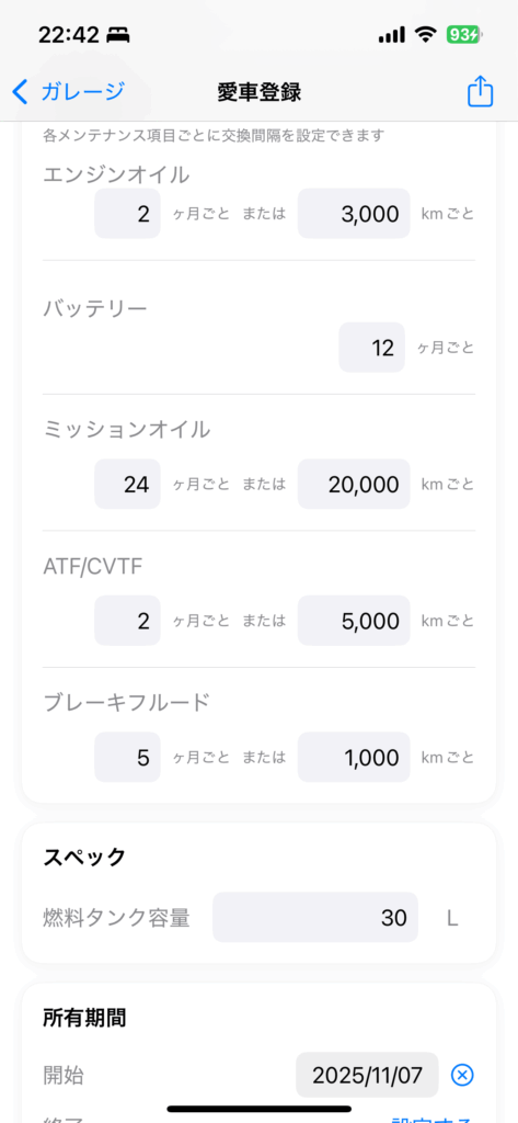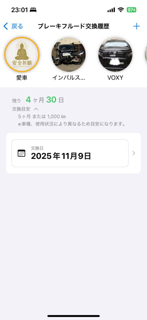 自分で設定したブレーキフルードの交換間隔は、「最新履歴画面」と「ブレーキフルード履歴画面」に適用されます。